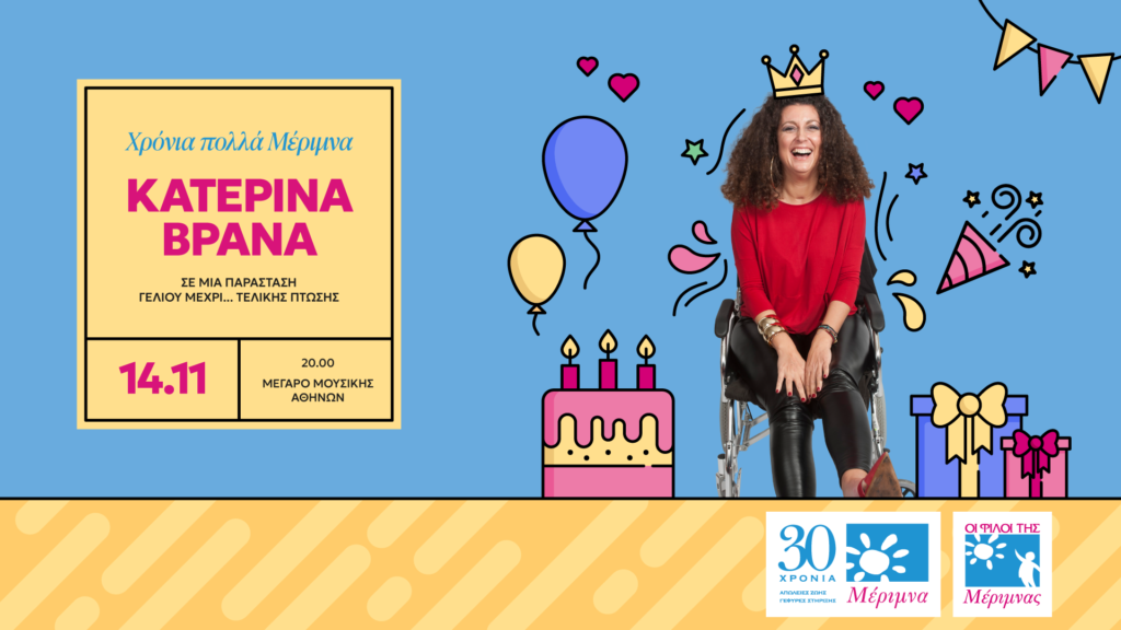 Την Παρασκευή 14 Νοεμβρίου, στο πλαίσιο του διήμερου εορτασμού, οι Φίλοι της Μέριμνας, διοργανώνουν μία αποκλειστική εορταστική παράσταση για τα γενέθλια της Μέριμνας στο Μέγαρο Μουσικής Αθηνών με την αγαπημένη stand-up comedian, Κατερίνα Βρανά!