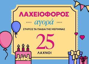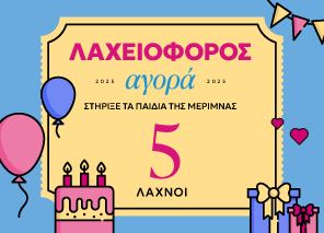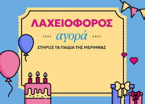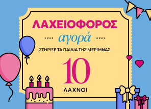 Με κάθε λαχνό αξίας 3 € προσφέρετε στήριξη στο έργο της Μέριμνας για τα παιδιά και τις οικογένειες τους που αντιμετωπίζουν απώλεια ή απειλητική για την ζωή ασθένεια.