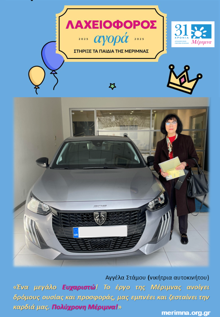 «Ένα μεγάλο ευχαριστώ στη Μέριμνα για την υπέροχη λαχειοφόρο αγορά της! Είμαι πολύ χαρούμενη και συγκινημένη που κέρδισα το εξαιρετικό δώρο (αυτοκίνητο Peugeot 208, 1.2cc style Artense) και παράλληλα στήριξα τον σκοπό της. Ήταν μια πολύ όμορφη έκπληξη! Θερμά συγχαρητήρια για την άψογη διοργάνωση, την πρωτοβουλία και τη γενναιοδωρία της Μέριμνας. Εύχομαι καλή επιτυχία στις επόμενες δράσεις της και να συνεχίσει το σπουδαίο έργο και την κοινωνική προσφορά της. Το έργο της Μέριμνας ανοίγει δρόμους ουσίας και προσφοράς, μας εμπνέει και ζεσταίνει την καρδιά μας. Πολύχρονη Μέριμνα! Να γιορτάζεις κάθε μέρα παντοτινά! Με εκτίμηση και αγάπη, Στάμου Αγγέλα»